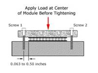 Several methods for installing Peltier modules have been developed, including: mechanical lamping, epoxy bonding, and direct solder bonding. The individual requirements of the application will determine which method is most appropriate, however, mechanical clamping is by far the most common. Mechanical Clamping Method: The following is a list of guidelines for using mechanical clamping: 1. Lap or grind all the mounting surfaces flat to within 0.025 mm (0.001 inch). 2. Clean the mounting and module surfaces to ensure all burrs, chips, etc have been removed. 3. If more than one module is to be used in the assembly, all modules should be within 0.025 mm (0.001 inch) in height/thickness. 4. Coat the hot side of the module with a thin layer of thermal grease, then place it on the heat sink. Applying firm but even downward pressure, move the module in clockwise/counter clockwise motions. Do this until a slight resistance is felt and excess thermal grease is squeezed out. 5. Coat the cold side of the module with a thin film of thermal grease. Repeat the process described in step 4. 6. Apply a light load in line with center of module by using clamp or weights, and locate bolt holes in your assembly such that they are at opposite sides of the center of the module between 1.6 mm to 12.7 mm (0.063 to 0.5 inches) from the sides of the module as Figure 2.