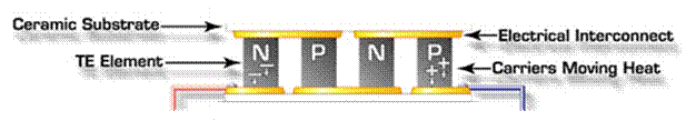 1. Important Installation Notes Peltier modules contain a relatively fragile thermoelectric material and ceramics (as shown in Figure 1), they require careful handling and strict compliance with the installation rules. Failure to meet these rules may result in reducing Peltier module performance, lower life time or complete breakdown. When installing Peltier modules, pay attention for the following recommendations: 1. Impacts, dropping of the module on a hard surface etc. may cause irreparable damage to the module. 2. The mounting surfaces (between which modules are to be clamped) should be flat to within 0.025 mm (0.001 inch). 3. Module surfaces must have a good thermal contact with the cooled object and heat-eliminating surface. 4. Avoid excessive mechanical loading of the module for the modules are relatively strong in compression and weak in shear. 5. Do not use acuminate tool to position the modules to avoid break the thermoelectric material. 6. The force on the wire cannot be in the direction of up and down or left and right besides the Lead-Out direction. 7. Accurately spot the hot side and cold side of the module. The "hot" and "cold" sides of standard Peltier modules may be identified by the position of the wire leads. Wires are attached to the hot side of the module, which is the module face that is in contact with the heat sink.For modules having insulated wire leads, when the red and black leads are connected to the respective positive and negative terminals of a DC power supply, heat will be pumped from the module's cold side, through the module, and into the heat sink. Note that for Peltier modules having bare wire leads, the positive connection is on the right side and the negative connection is on the left when the leads are facing toward the viewer and the substrate with the leads attached presented on the bottom.