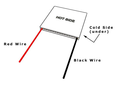 The power module has large thermal expansion. When the module is running and cycling over large temperature difference, the proper mounting to ensure even pressure applied on module is very important. Please read through below before installation. Hot Side and Cold Side Identification: The modules will generate electricity only if there is a temperature difference cross the modules. So, you need to attach one side of the modules to a heat source and the other side to a cool source like heat sink to dissipate the heat coming from heat source through the modules. Our module is unique and different to others. The modules have cold and hot sides. You should attach the cold side to heat sink or heat exchanger, and hot side to heat source. Then the positive output is in red wire, if reversed, then in black color wire. The temperature on the hot side of the module can work continuously at as high as 330 °C (626 °F) and intermittently up to 400 °C (752 °F). But the temperature at cold side of the module cannot work properly above 200 °C (392 °F). So, if the mounting is reversed, and the cold side of module is attached to heat source above 200 °C (392 °F), the module will degrade quickly or fail immediately. So, please ensure hot side attached to heat source is very important. Below is the diagram to show which side of module is hot or cold one, where the wire direction faces you. ( Usually, you also can see a marking” Hot Side” on hot side ceramic plate) The positive output will be on red color wire if the installation is correct. The reversed installation will lead to negative output from red color wire.