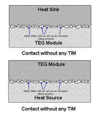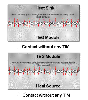 Thermal Interface: Microscopic Look at Surfaces Even when you have two “flat and smooth” surfaces, they are far from truly flat or smooth. The diagram below shows what’s really going on at a microscopic scale.