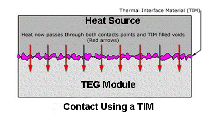 The above image shows how the remaining valleys create voids through which heat energy can barely pass through, in effect creating an insulated area – not the ideal thermal interface. Surface Finish and Preparation As a minimum, any surface intended to be part of a thermal interface should be flat to ± 0.001 inches over the entire interface surface and smooth to a surface finish of 32 micro inches or better. The interface surface must be thoroughly cleaned.Once all machining and polishing is completed. Do not touch the surface with bare hands (skin oils) or allow any contact with other materials. It is better to complete this final cleaning stage just before assembly so as to minimize any dust or contamination. Thermal Interface Materials (TIM) A “third party” interface material is needed since it is all but impossible to achieve ideal flat and smooth surfaces. The purpose of the TIM is to fill the valleys and gaps with a compressible material that has a much higher thermal conductivity (ability to transfer heat) than the air gaps it replaces. This essentially makes the entire interface transfer heat instead of just where the peaks were contacting. The following image shows how the situation has been dramatically improved.