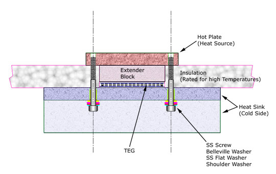 Applying the TIMr Here we prefer to use the high thermal conductive graphite sheet which has high thermal conductivity and can operate from -40 °C to 400 °C. Our TEG module is stuck with such the high thermal conductivity graphite sheet on its both sides ceramic plates to provide low contact thermal resistance, hence you do not need to apply thermal grease or other thermal interface materials when you install the module. The graphite sheet can work well in extremely high temperature. TEG Mounting: TEGs should be mounted using the compression method. That is, the TEG is compressed between a hot plate and a heat sink (or water block) that will be cooler. The compression or clamping should be created with stainless steel machine screws on either side of the TEG. See Exploded View and Section View images below.