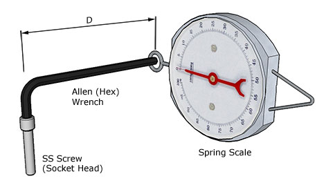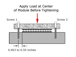 Clamping Procedure: Before tightening the screws, apply a light load/force in line with the center of the TEG by using a clamp or weights. Make sure the clamp or weights apply the force evenly and at the center. Bolt carefully, by applying torque (tightening the screws) in small increments, and alternating between screws. It is of the utmost importance that the screws are tightened evenly in small increments back and forth. If one screw is over tightened, then the tightening of the second screw may crush the TEG. [See 2nd image above] Use a torque limiting screwdriver for best accuracy. Note: If a torque screwdriver is not available, a reasonably accurate pull spring scale attached to the end of an L-shaped hex (Allen) wrench (this is a good reason to use socket head cap screws) can be used to determine when the screw torque is reached. Make sure the spring scale is pulled perpendicular (90°) to the Allen (Hex) Wrench at all times.